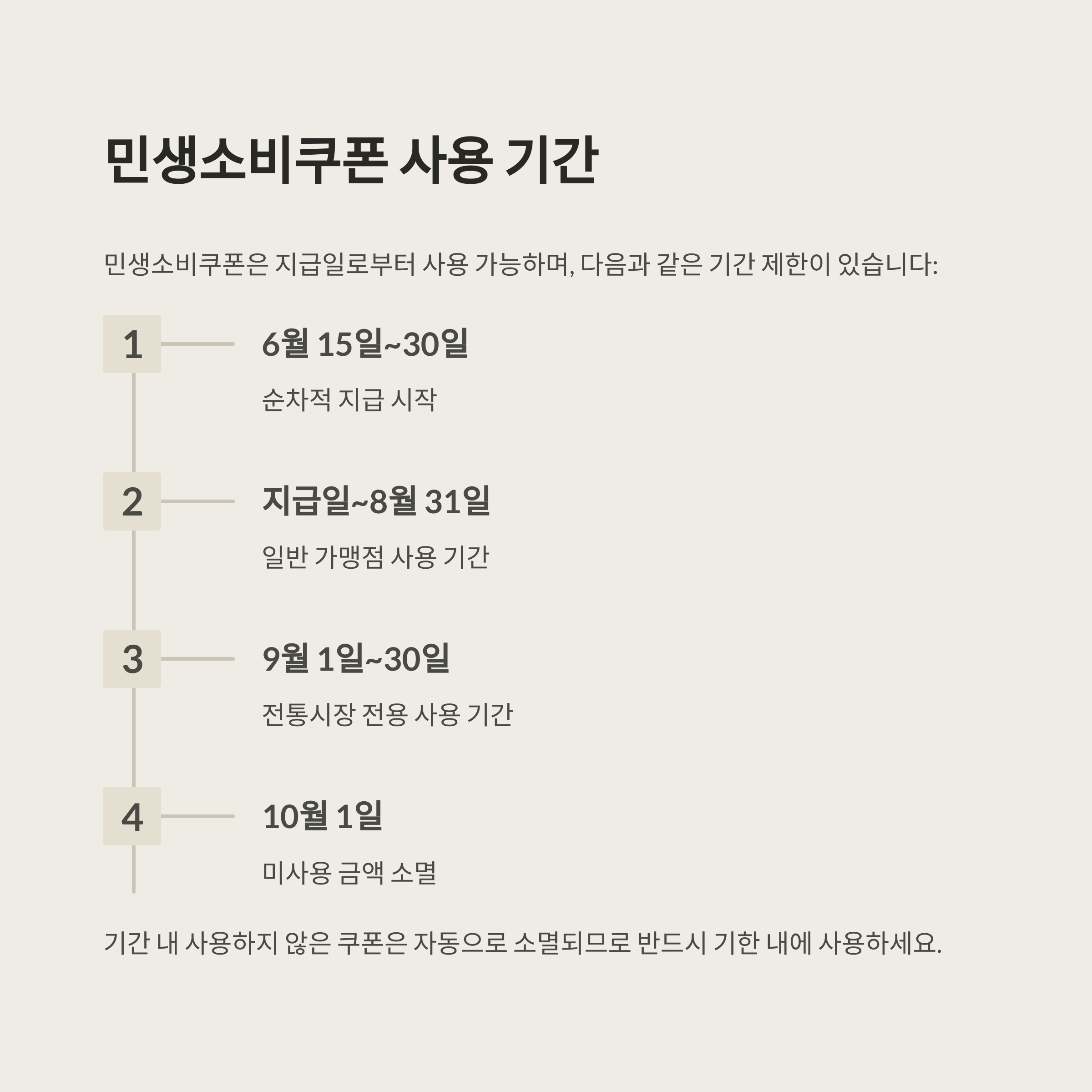 소비쿠폰은 단기간에 소비를 촉진하기 위한 목적으로, 지급일로부터 3개월~6개월 정도의 사용 기한이 설정될 것으로 보입니다. 기한 내에 사용하지 않은 잔액은 자동으로 소멸되므로, 잊지 말고 꼭 사용해야 합니다.