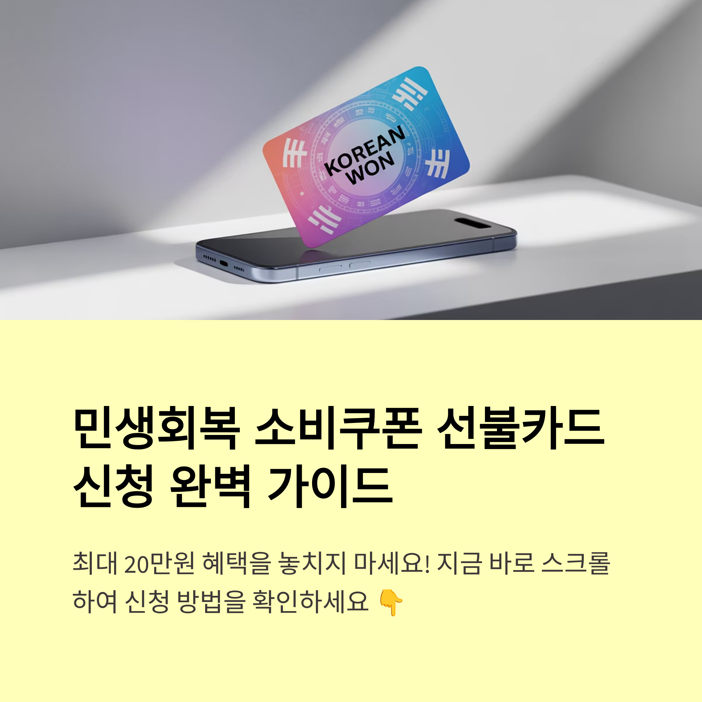 ✔️ 핵심 요약민생회복 소비쿠폰 선불카드는 **2025년 하반기**부터 전국민 대상로 시행.신청은 **공인인증서 없이**‘정부24’앱 또는 웹에서 간편하게!사용처는 **전통시장·소상공인 매장 등 전국 가맹점**—소비촉진 기대. 1. 민생회복 소비쿠폰 선불카드란?민생회복 소비쿠폰 선불카드는 코로나 이후 급감한 소비 심리를 회복하기 위한 **국민 지원 정책**입니다. 신용카드 방식 대신 **선불카드** 형태로 지급되어, 사용 제한과 투명성을 확보했습니다.대상: 전 국민지급 방식: 선불카드 (모바일/실물)사용처: 전통시장, 소상공인, 가맹점 2. 신청 자격과 기간신청 자격은 만 18세 이상 국민과 외국인 등록자가 신청할 수 있으며, 2025년 6월 1일~8월 31일까지 온라인 또는 오프라인으로 접수 가능합..