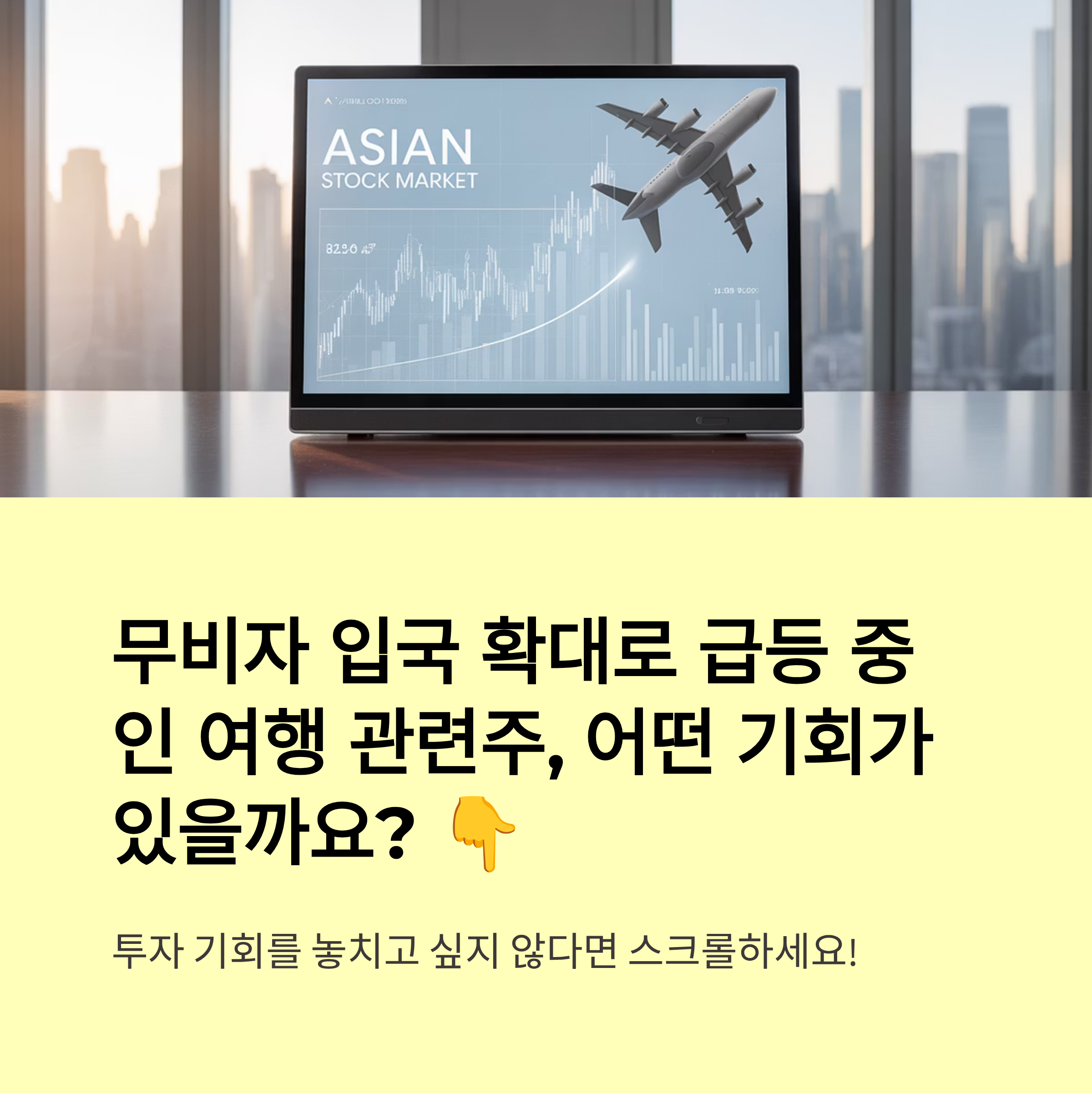 “정부가 중국인 단체 관광객에 무비자 입국 정책을 실시한다는 소식에, 국내 주요 여행주와 관광주가 무더기 급등세를 보이고 있습니다.”2025년 9월부터 2026년 6월까지 대규모 호재가 확정되며 여행사·호텔·면세·글로벌 소비주가 단숨에 투자자 관심 1순위로 떠올랐습니다.이번 포스팅에서는 왜 이렇게 주가가 급등했는지, 어떤 종목들이 더 강한 흐름을 보이는지, 앞으로 실제 체감 효과와 투자전략까지 한 번에 정리합니다.이슈 요약:- 중국 단체관광객 무비자 입국 2025.9.29~2026.6.30 한시적 전면 허용! - 단 하루 만에 노랑풍선(상한가 29.96%), 참좋은여행(24.25%), 모두투어(11.84%), 호텔신라(5.21%) 등 여행/관광주 급등 - 정부 공식 발표 이후, “방한 관광수요 유발→지역..